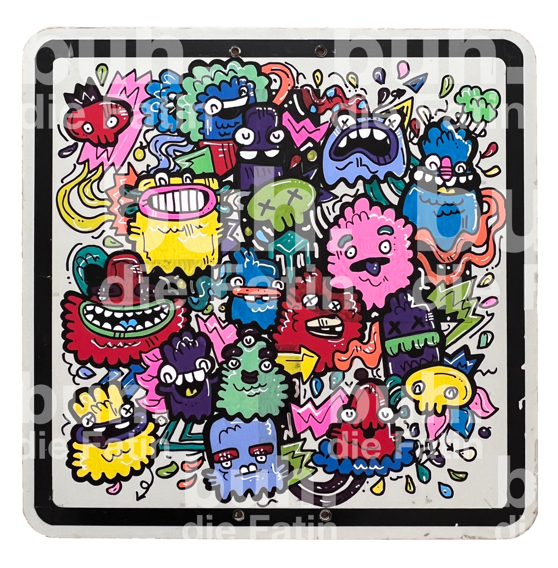 Dieses original erworbene Straßenschild misst 42x42 cm und zeigt bunte Monster, die aus der Mitte heraus zu explodieren scheinen. Sie symbolisieren die Liebe auf den ersten Blick – einen Funken, der alles entfacht. Das handbemalte Unikat von Fatin Rahmouni ist sofort bereit zum Aufhängen und verbindet lebendige Street Art mit einer kraftvollen, emotionalen Botschaft. Ein besonderes Kunstwerk, das jedem Raum Energie und Ausdruck verleiht.